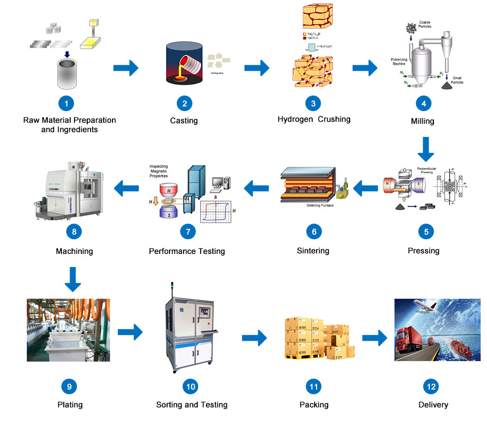 1. Samenstellingsontwerp: Het samenstellingsontwerp van gesinterde NdFeB is erg belangrijk. Het heeft betrekking op de vraag of de productkwaliteit en magnetische prestatie-indicatoren kunnen voldoen aan de eisen van de klant, omdat veel intrinsieke magnetische eigenschappen van het materiaal, zoals magnetische polarisatie, Curietemperatuur, etc. worden bepaald door de samenstelling van het materiaal. Het basisprincipe van het compositieontwerp is het garanderen van voldoende hoge intrinsieke prestaties, terwijl de materiaalkosten uitgebreid in aanmerking worden genomen. (De kosten van grondstoffen vertegenwoordigen ongeveer 65% -90% van de totale kosten van gesinterde NdFeB-materialen. Vanuit het uitgangspunt dat aan de magnetische prestatie-eisen van de gebruiker moet worden voldaan, moeten zoveel mogelijk goedkope componenten worden gebruikt en moeten zeldzame aardmetalen en andere edelmetaalmaterialen minder worden gebruikt)