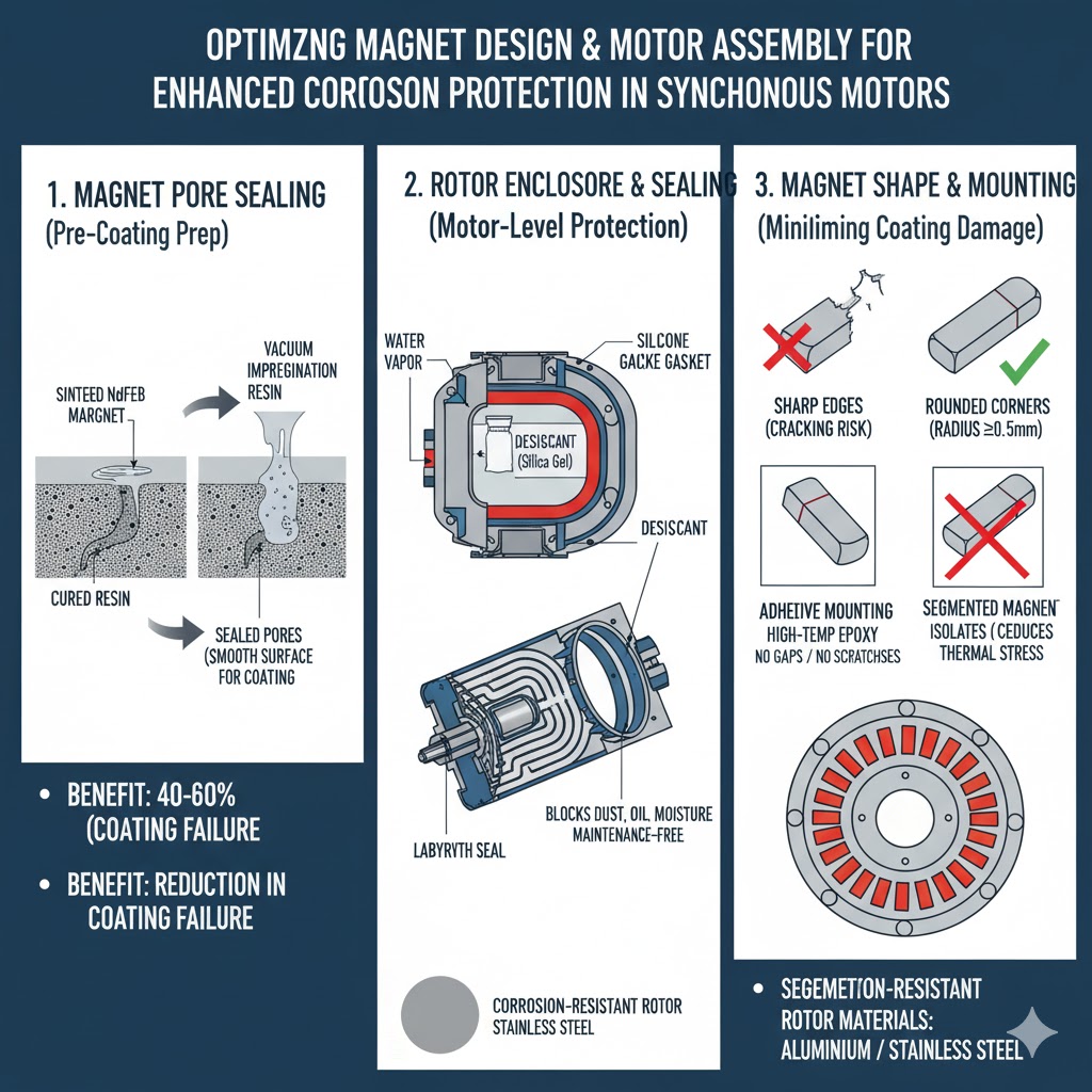 Oppervlaktecoatings alleen zijn niet voldoende; ontwerpkeuzes voor de magneet- en motorconstructie spelen een cruciale rol bij het minimaliseren van het corrosierisico. Deze optimalisaties vormen een aanvulling op coatings en verlengen de levensduur van de magneet: