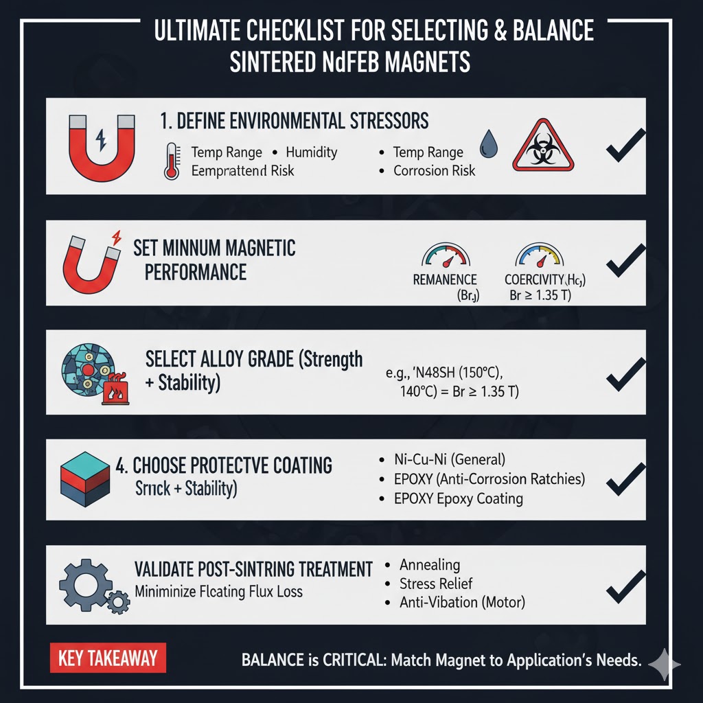 Sommige gebruikers geven prioriteit aan maximale remanentie (bijvoorbeeld door N55-kwaliteit te kiezen) voor toepassingen bij hoge temperaturen, maar ontdekken dat de magneet snel demagnetiseert. Omgekeerd kan het teveel toevoegen van Dy om de coërciviteit te vergroten de magneet te broos maken voor gebruik dat gevoelig is voor trillingen (bijvoorbeeld elektrisch gereedschap). De oplossing is om eerst ‘kritieke limieten’ te definiëren: bijvoorbeeld ‘moet bestand zijn tegen 120°C en 500 uur vochtigheid’ voordat een kwaliteit wordt geselecteerd.